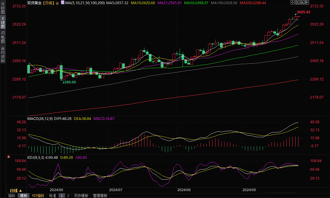 现货黄金高位震荡,目前交投于2672.15美元/盎司。周四金价再度冲高,一度刷新历史高点至2685.49美元/盎司,收报2672.25美元/盎司,因以色列周四拒绝国际要求与真主党停火的呼吁,无视其在华盛顿的最大盟友,并继续发动空袭,不断推升避险情绪。不过,美国初请失业金数据表现靓丽,给美债收益率提供支撑,纽约时段金价在历史高位下方震荡,未能进一步走高。