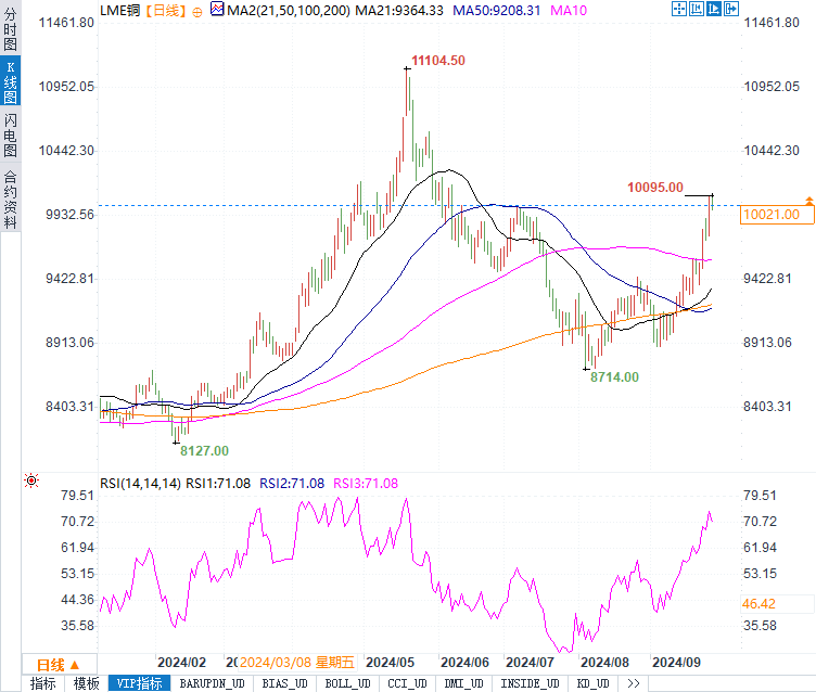值得注意的是,中国政府近期的经济刺激措施也是推动铜价上涨的重要因素之一。本周,中国政府降低利率,并向银行注入流动性。这一系列措施提振了市场信心,使得铜价一度创下自5月以来的最大单周涨幅。随着中国经济刺激措施持续,市场预计铜的需求会进一步增加,这将为价格提供短期支撑。