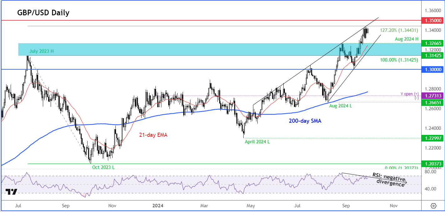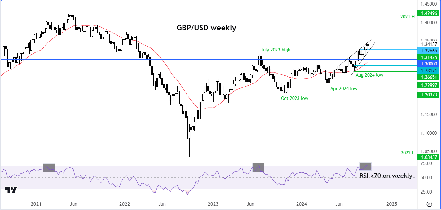 英镑兑美元正在接近超买水平。相对强弱指数 (RSI) 等动能指标在攀升至70.0关口上方时表明需谨慎行事。