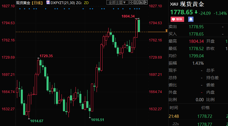 现货黄金上涨1.68%至1782.39美元/盎司;COMEX期金主力合约上涨2.13%至1792.8美元/盎司;