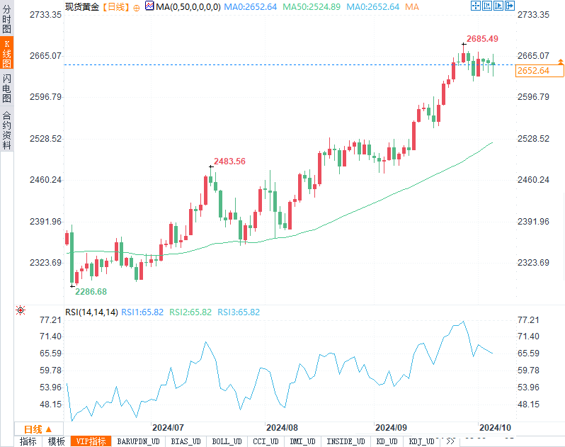 现货黄金下跌至2651.56美元/盎司,黄金期货收于2667.80美元/盎司。美国9月就业数据意外强劲,新增25.4万个就业岗位,失业率降至4.1%,大幅超过市场预期。这一数据进一步降低了市场对美联储11月会议上大幅降息的预期,导致美元走强,抑制了黄金的避险需求。