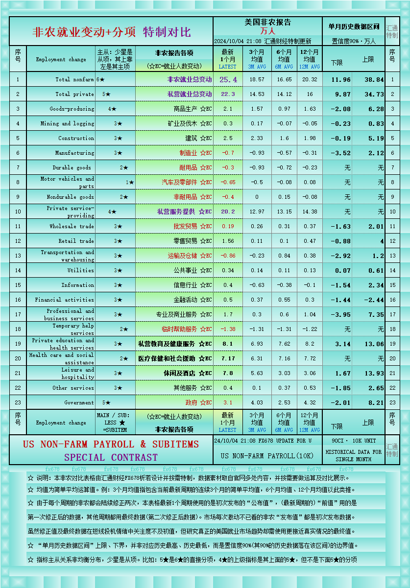 汇通财经APP讯——一张图:美国非农就业+各行业分项就业变动一览,包括最新值、3个月均值、6个月均值、12个月均值、各项就业指标历史数据置信度90%的区间(指月度历史数据有90%的历史数据落在该区间内)。研究非农“细分项”的看过来,详见下方汇通财经特制图表。