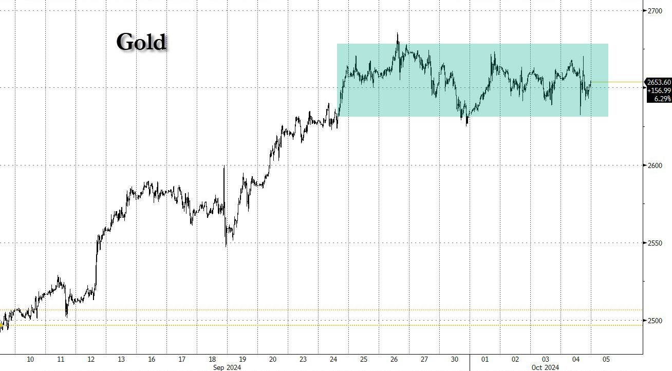 此外,根据Zerohedge在10月5日的一篇文章中分享的分析,黄金显示出弹性,并保持在略低于历史高点的狭窄交易区间。分析指出,尽管美元达到两个月来的最高水平,但这种交易模式还是出现了。为此,黄金正在一个明确的区域内盘整,稳定在2653美元/盎司左右。