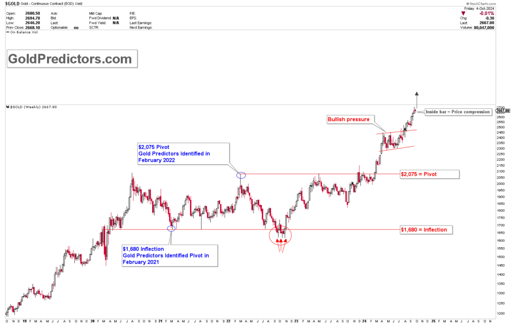 根据Gold Predictors 10月5日发布的分析报告,这一前景的一个关键特征是出现了“内包线形态”(Inside Bar),这意味着价格受到挤压,这种现象通常表明市场正在为大幅波动做准备。