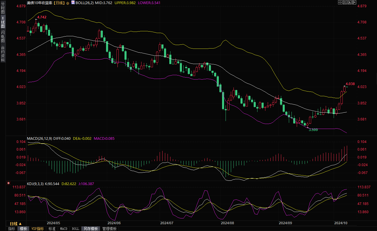 10年期国债收益率周一比上周五晚些时候上升3.9 个基点,至4.019%,为连续第四日上涨,此前触及 7 月底以来最高的 4.038%,上周五曾上涨 13 个基点,创 6 月 30 日以来的最大单日涨幅。美国经济 9 月新增 25.4 万个就业岗位,高于经济学家的预期,失业率出人意料地从 4.2% 降至 4.1%。