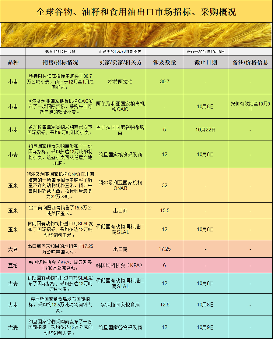 国际市场方面,沙特阿拉伯在近期招标中购买了30.7万公吨小麦,预计将在12月至1月之间交付。此外,阿尔及利亚、孟加拉国、约旦等国的多项小麦招标也将在10月内陆续结束。这些国际采购活动将继续支撑全球小麦价格,尤其是当前美国种植季面临气候风险,未来几个月全球小麦供应可能受到进一步扰动。