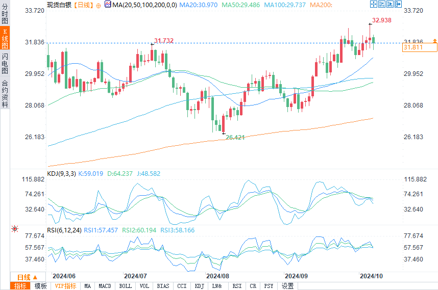 现货白银报31.827美元/盎司,跌幅1.03%。