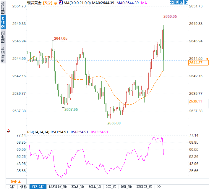 现货黄金短线内迅速反弹,最高触及2650美元/盎司,现报2644.12美元/盎司,录得日内涨幅约0.78%。黄金的这一涨幅反映出市场对通胀风险的担忧,避险情绪再度升温。而与此同时,