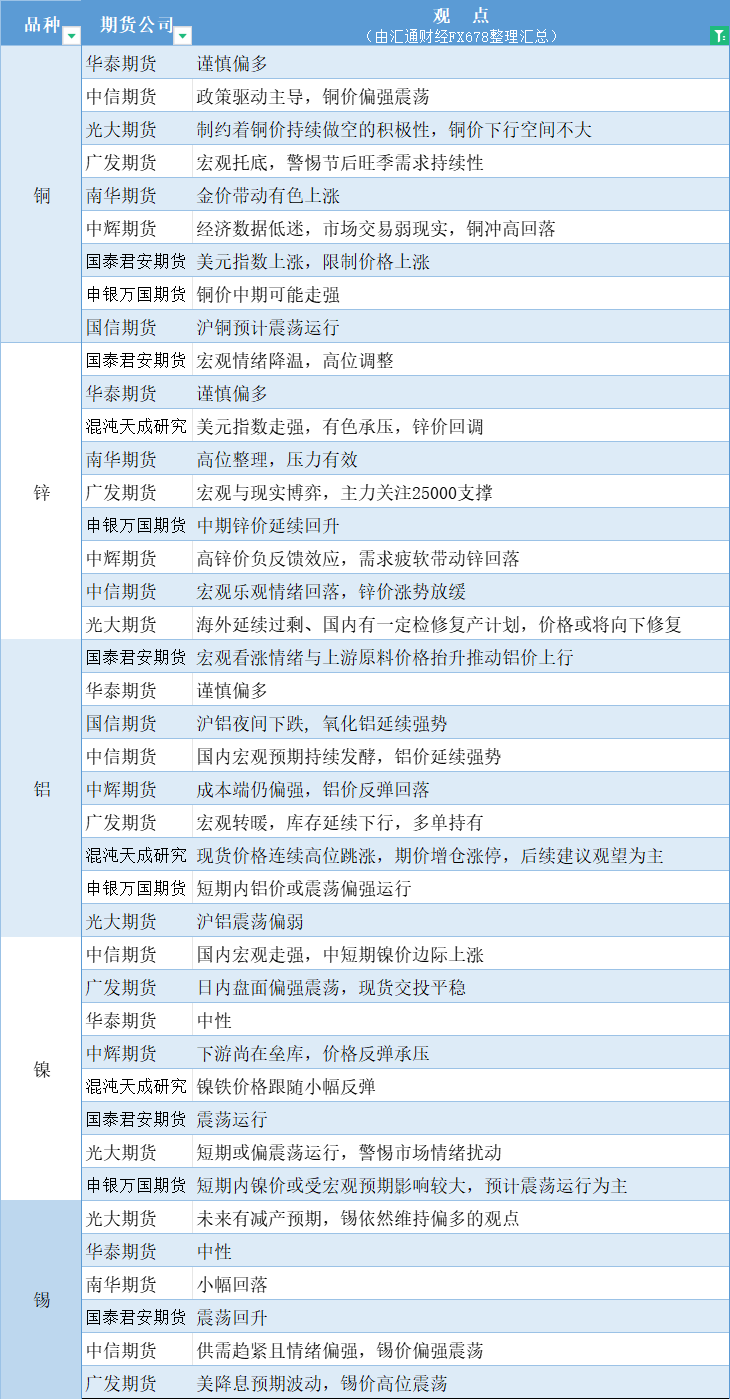 标题:期货公司观点汇总一张图:10月15日有色系(铜、锌、铝、镍、锡等)