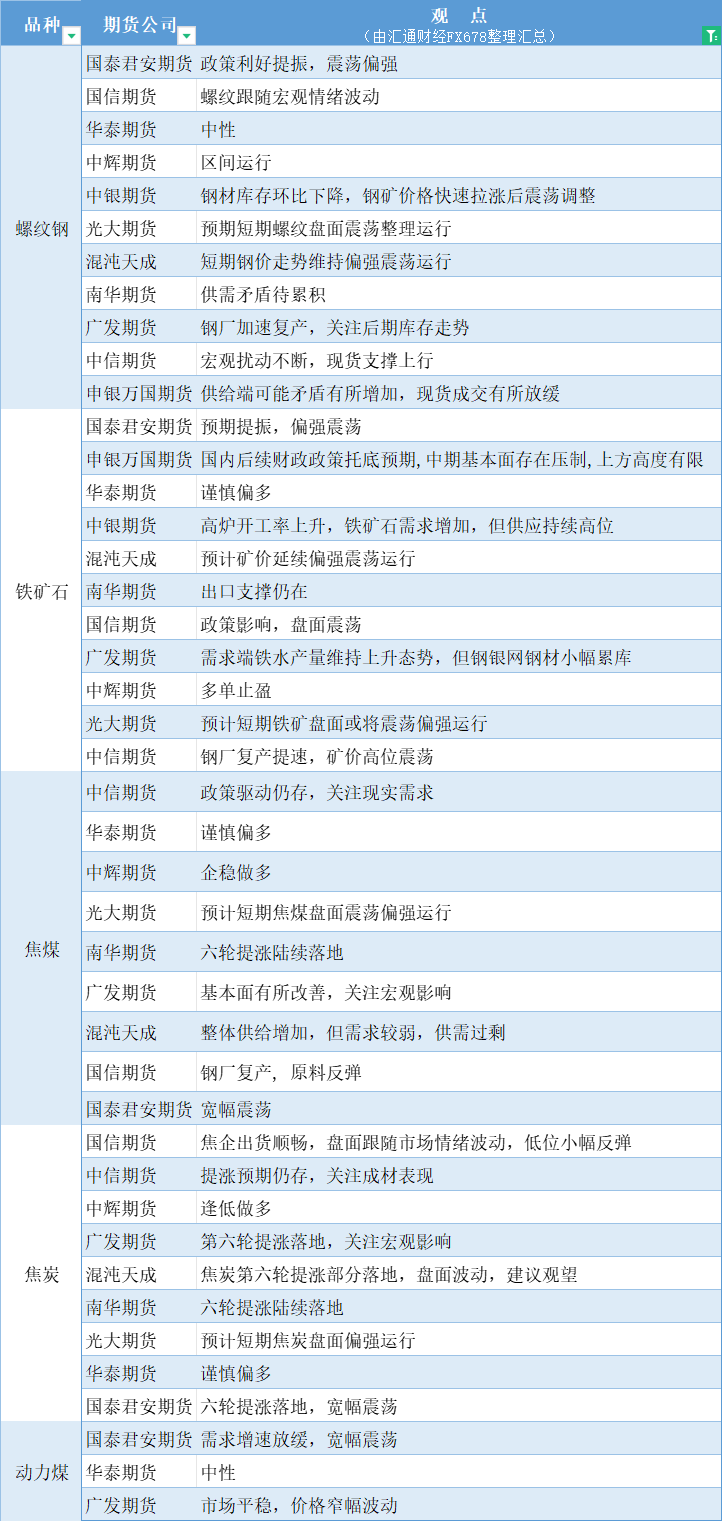 期货公司观点汇总一张图:10月15日黑色系(螺纹钢、焦煤、焦炭、铁矿石、动力煤等)