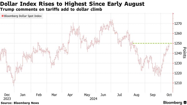 汇通财经APP讯——美国彭博社周二(10月15日)报道称,随着美国前总统特朗普(Donald Trump)为大幅提高外国进口关税的提议辩护,美元攀升至两个月来的最高水平,墨西哥比索则出现暴跌。