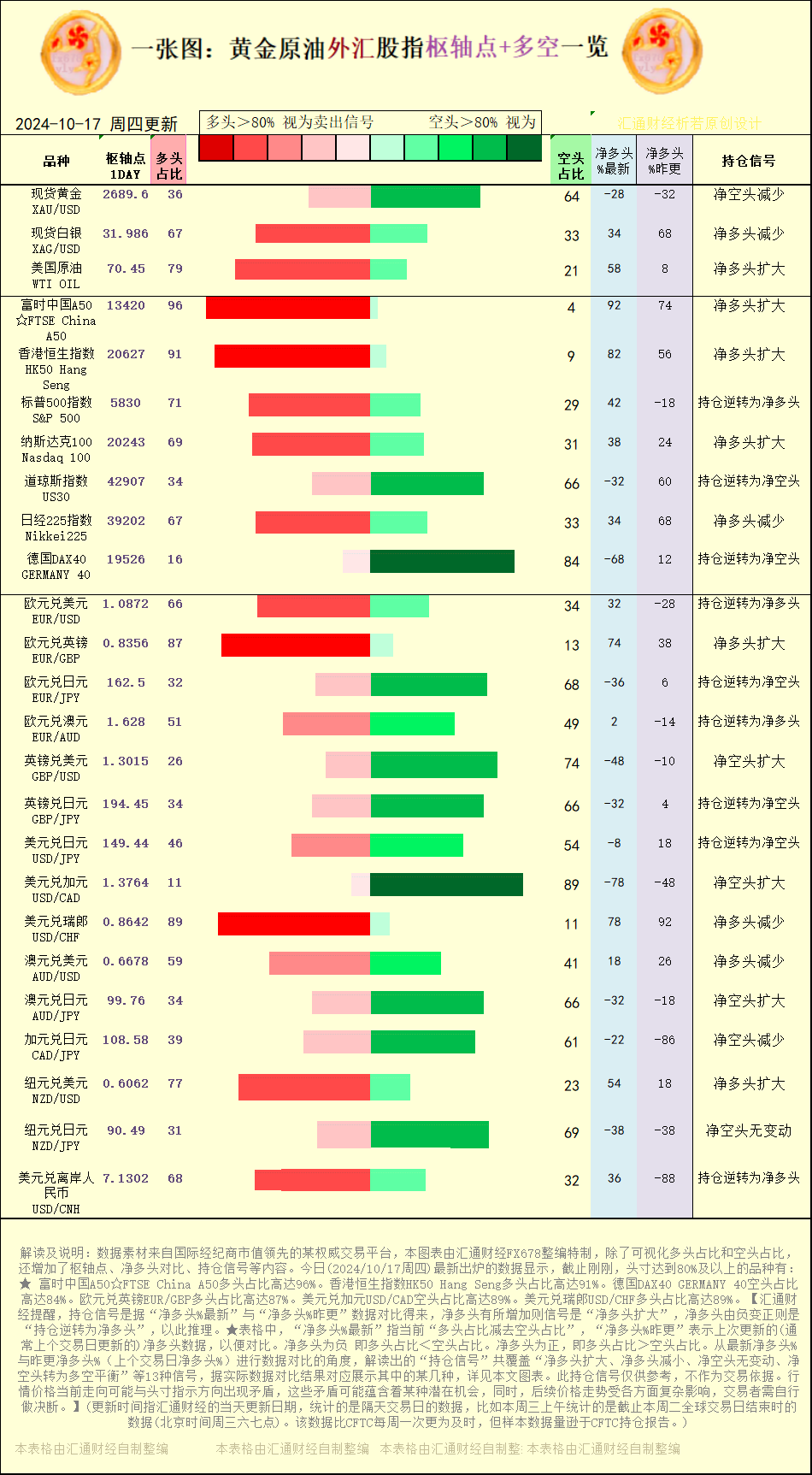 标题:一张图:2024/10/17黄金原油外汇股指“枢纽点+多空持仓信号”一览