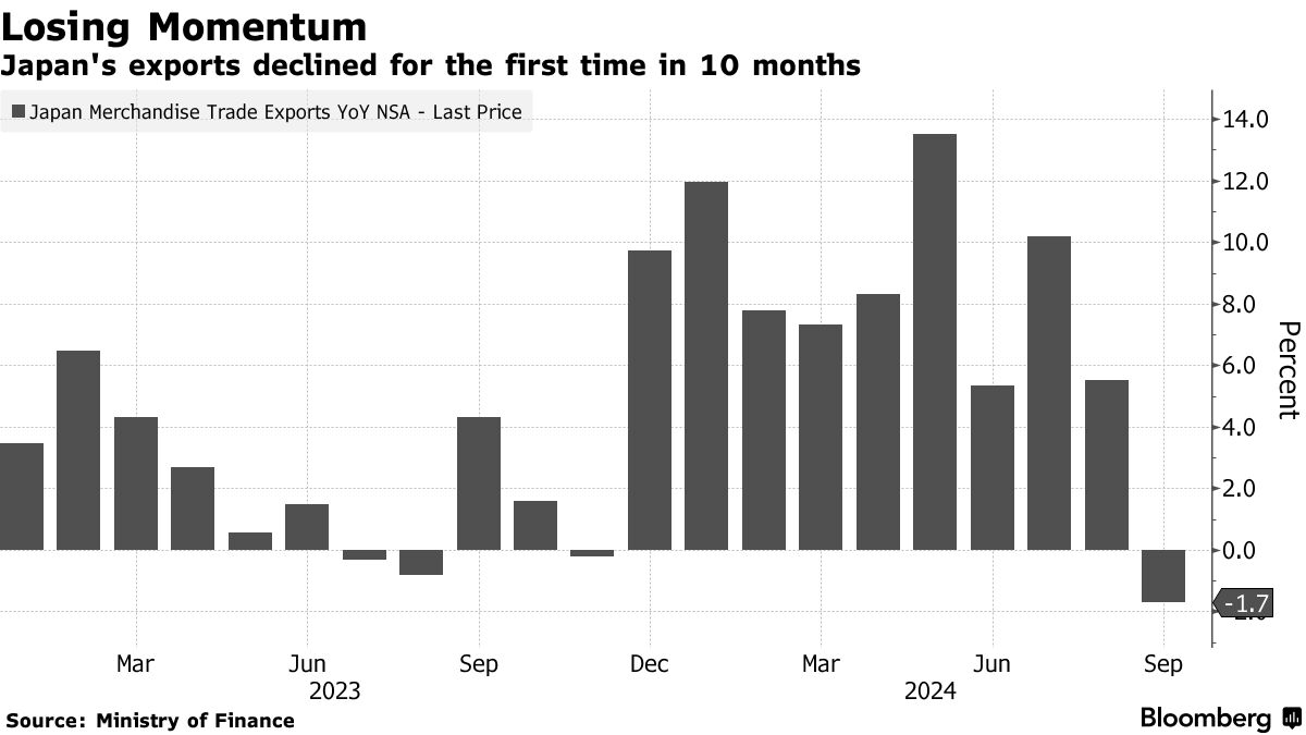 出口疲软反映出全球经济增长乏力,主要经济体前景的不确定性日益增加,尤其是那些央行已开始降息以避免经济进一步放缓的国家。9月,美联储宣布降息50个基点以维持经济,欧洲央行也做出了类似决定。预计欧洲央行将在周四的会议上再次降息。