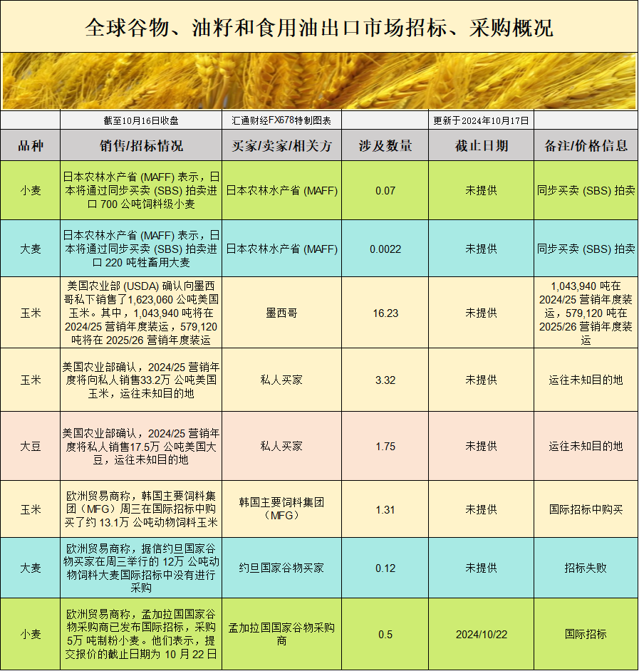 CBOT持仓变动与小麦市场情绪CBOT小麦投机性净多头头寸近期呈现增加,反映出市场对小麦价格回升的预期。美国农业部数据显示,截至10月16日,全球多个国家和地区的小麦采购活动正在进行中。特别是孟加拉国发布的5万吨制粉小麦国际招标,将成为未来几周市场关注的焦点之一。虽然日本的采购量相对较小,但这些招标显示出国际买家对小麦的需求稳定。