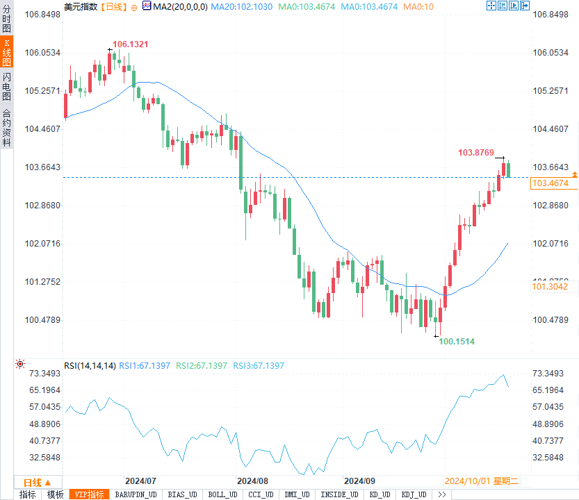 美元指数经过连续五日的上涨后,周五稍事喘息,最终下跌0.3%,报103.49。尽管如此,本周美元整体表现强劲,周线势将连续第三周上涨,涨幅约为0.6%。