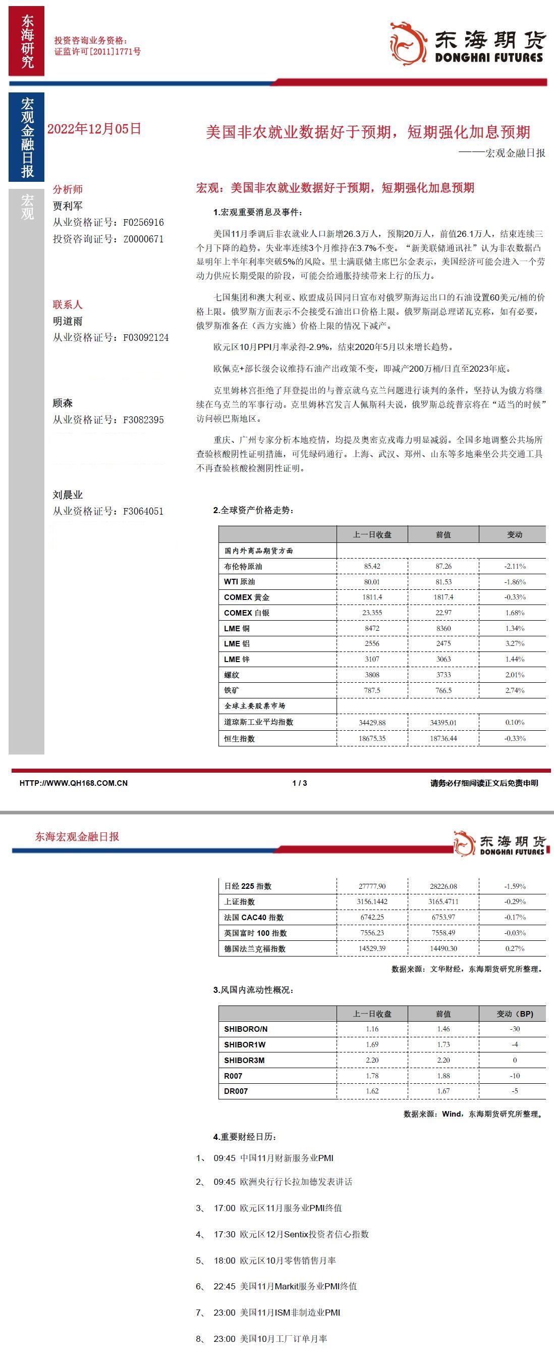 标题:【东海期货12月5日宏观金融日报】:美国非农就业数据好于预期,短期强化加息预期