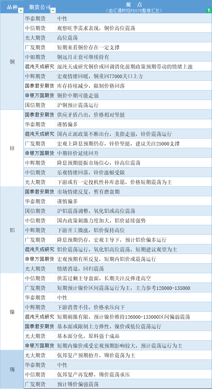 期货公司观点汇总一张图:10月21日有色系(铜、锌、铝、镍、锡等)
