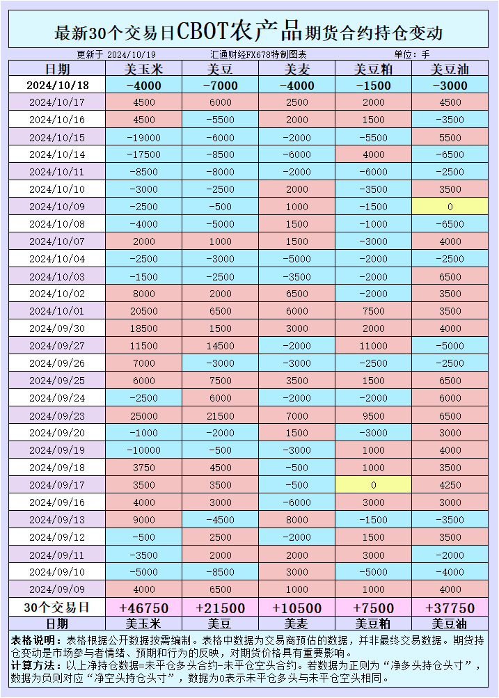 增加CBOT玉米投机性净空头;增加CBOT大豆投机性净空头;增加CBOT小麦投机性净空头;增加CBOT豆粕投机性净空头;增加CBOT豆油投机性净空头。