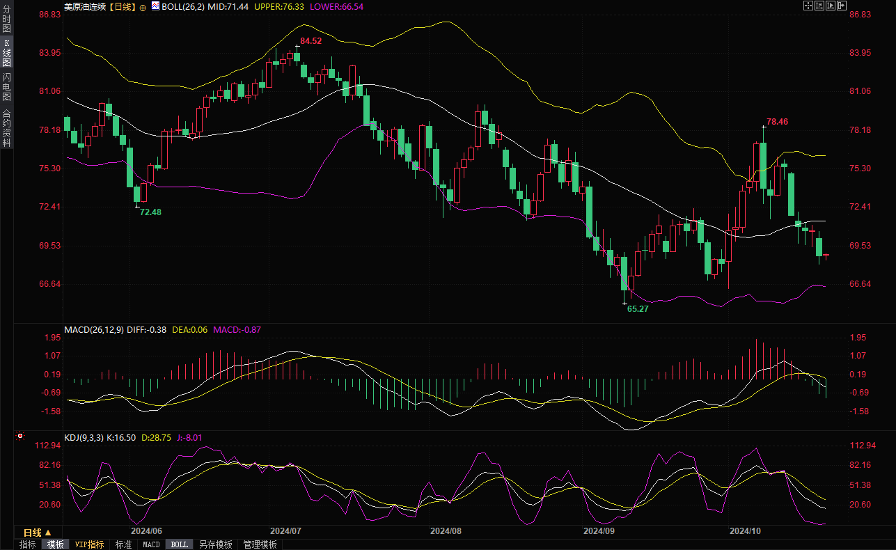 美原油跌破了70整数关口支撑,短线油价偏向空头,可能会进一步下探布林线下轨66.54附近支撑。