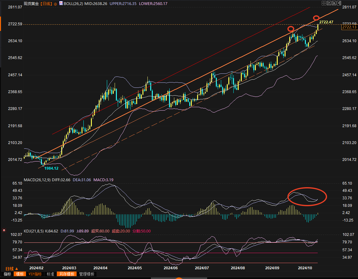 现货黄金周线收报2722.13极度接近历史新高2722.47美元/盎司,收涨2.45%为9月中旬以来最大当周涨幅。日图及其更小的多个级别看到明显的超买背离迹象,但还没有下跌警示信号。我们依然维持此前的看法:金价在冲破2700大关之后,多头的心理目标将会上移至2750美元/盎司。
