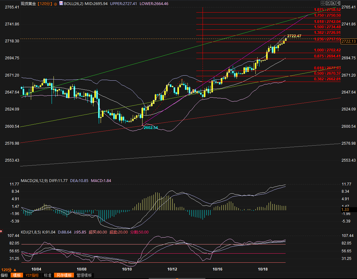 2H图显示,金价自2602及上周初的低点画扩展线,可以发现10月18日下午金价在冲破2700大关并冲高至2714一线后,回踩到2701.61而没有回踩2700关口,因为2702一线是上述扩展线的1.00扩展位。更上方的五档扩展位(1.382、1.50、1.618、1.75及1.875)分别在2726.7、2734、2742、2750及2758。其中,1.75扩展位的2750这里,还有其他两根线交叉于此价位附近,因此需要观察其带来的压力叠加效应。