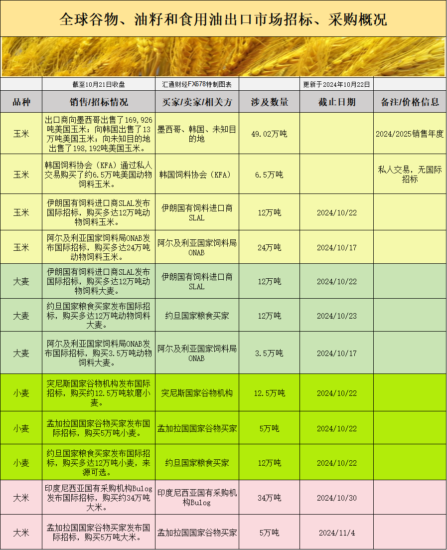 国际招标动态全球小麦招标市场表现活跃,突尼斯的国家谷物机构在国际市场上招标采购约12.5万吨软磨小麦,且提交价格报价的截止日期为10月22日。同样,约旦和孟加拉也发布了新的小麦采购招标,预计全球小麦需求将保持强劲。这些招标活动为小麦价格提供了支撑。