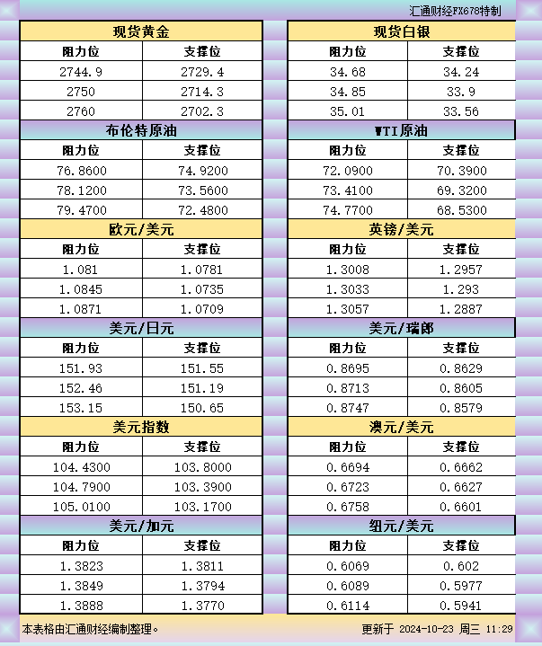 10月23日亚市支撑阻力:金银原油+美元指数等六大货币对