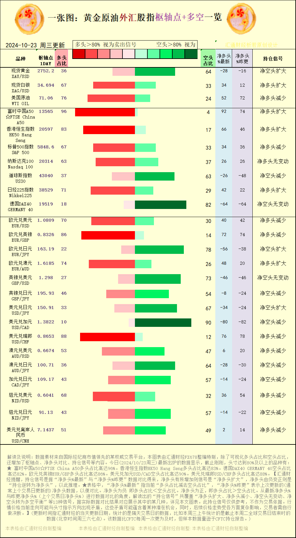 标题:一张图:2024/10/23黄金原油外汇股指“枢纽点+多空持仓信号”一览