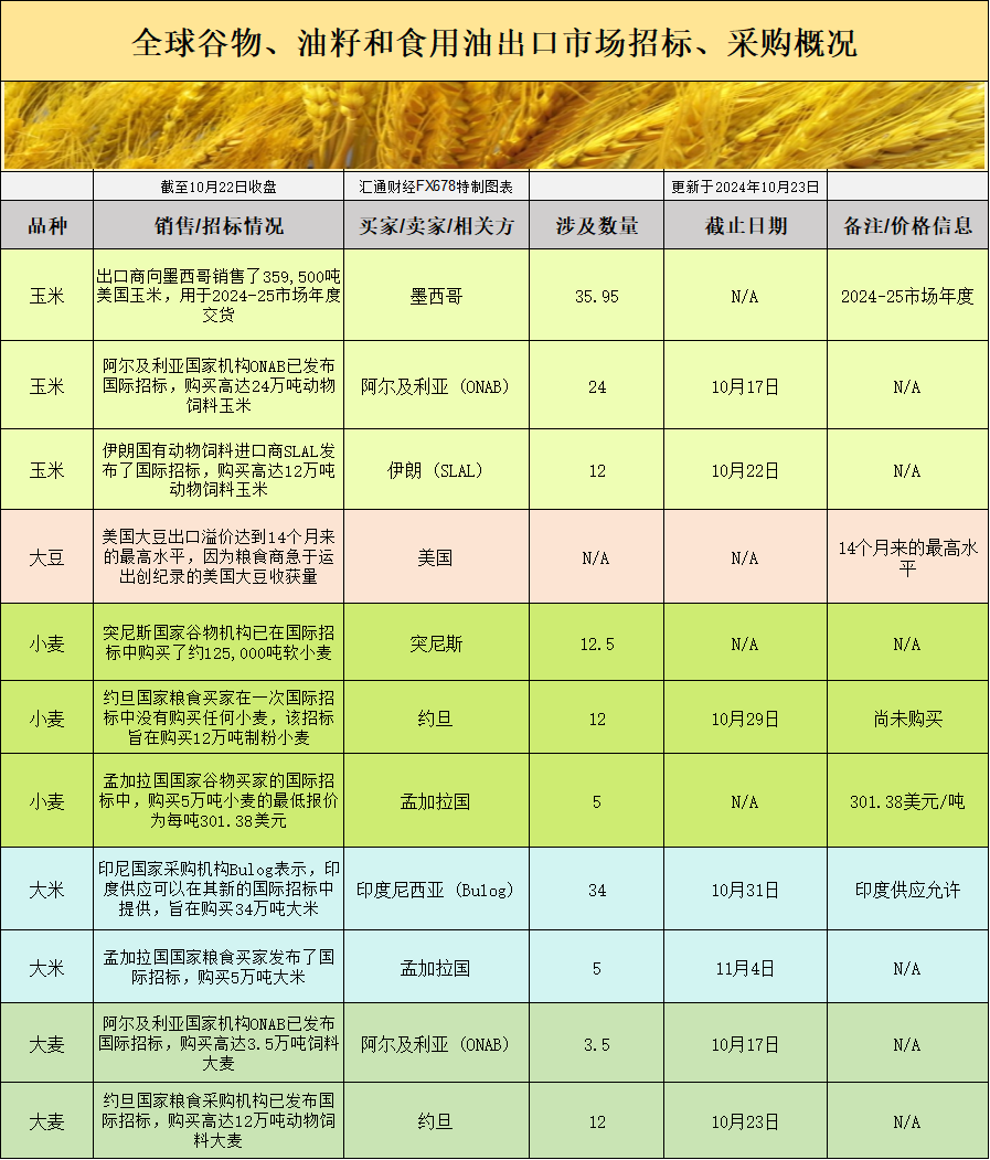 小麦市场在国际招标活动方面有所波动。突尼斯的国家谷物机构购买了125,000吨软小麦,而约旦的招标则未能成交,约120,000吨的采购需求被推迟到10月29日。孟加拉国方面,最新的国际招标报价为每吨$301.38,但尚未进行实际购买。