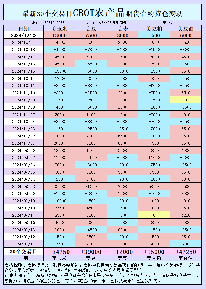 在大豆油市场,期货价格得到了持续的支持。10月22日,CBOT豆油期货价格上涨,与大豆价格的上扬趋势相一致。商品基金增加了豆油的投机性净多头仓位,反映出市场对未来豆油价格的看涨预期。