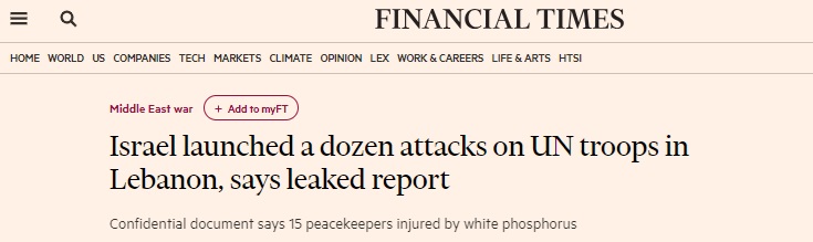 英国《金融时报》周二报道称,一份机密报告列出了以色列国防军最近袭击驻黎巴嫩国际部队的十几起事件,报告显示,以色列军队强行进入了一个有明显联合国标识的基地,并涉嫌在近距离使用白磷燃烧化学品,造成15名维和人员受伤。