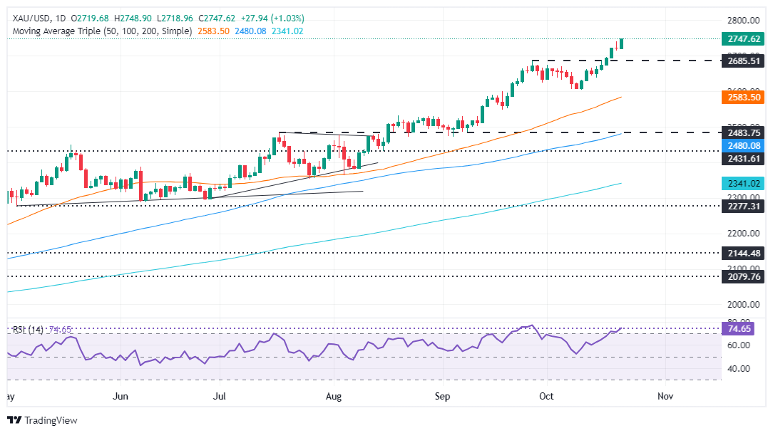 FXStreet分析师Christian Borjon Valencia指出,在地缘政治紧张局势和美联储进一步降息预期的支撑下,金价飙升至历史高点,接近2750美元/盎司大关。
