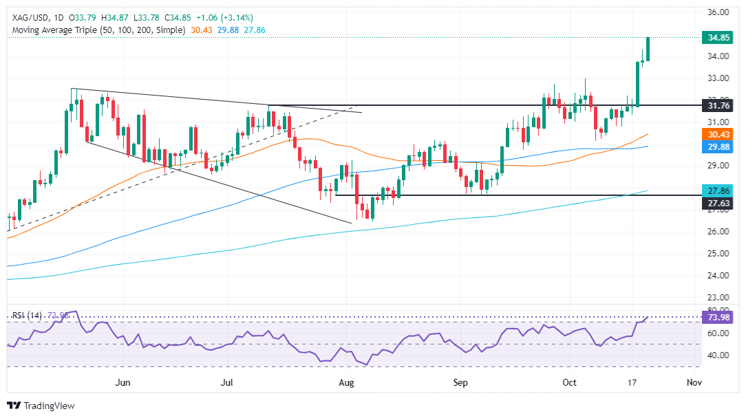 现货白银周二收盘暴涨3.24%,报34.847美元/盎司。