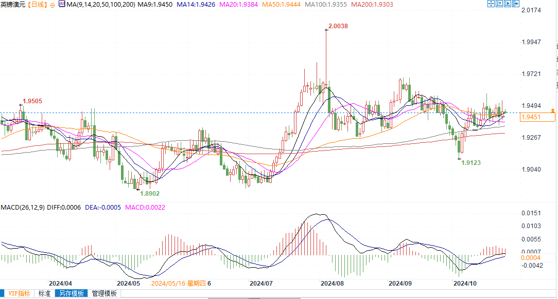 北京时间10月24日11:04,英镑兑澳元报1.9449/53