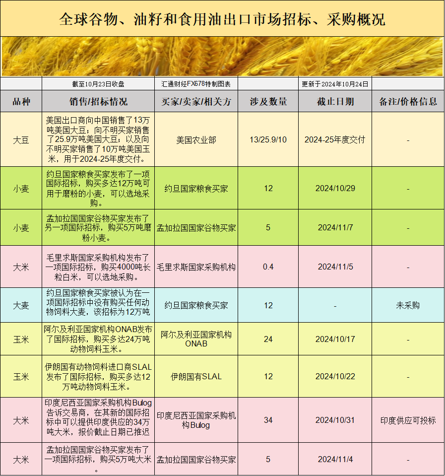 全球谷物、油籽和食用油出口市场招标、采购概况:
