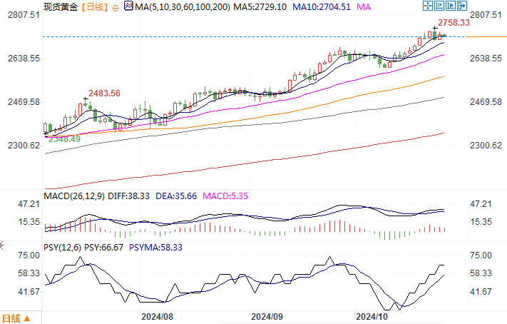 美元指数跌0.37%,报104.05,为连续三个交易日上涨后首次下跌。接下来,国际上以下一些大事件将可能继续凸显黄金作为传统避险资产的吸引力。首先,美国11月5日的总统大选在即,前总统特朗普与副总统哈里斯的竞争加剧了市场对财政赤字扩大的担忧。这种担忧将进一步增加了投资者对黄金的兴趣。其次,近期以色列和黎巴嫩南部的冲突升级,尤其是以色列针对伊朗的空袭计划,进一步刺激了市场避险需求。中东局势的不确定性不仅推高了原油价格,也为黄金提供了更多的买入动力。在地缘政治风险加剧的背景下,黄金无疑继续扮演着重要的避险角色。最后也是一直来影响黄金走势的主线暨美联储货币政策的动向。根据知名机构的分析,市场已基本消化了美联储将在11月降息25个基点的预期,而且12月份继续降25个基点的预期概率也不低。美元利率成本的持续下降,无疑在中长线的角度看有利于黄金的向上发展。然而,由于美国经济数据表现强劲,市场对更激进的货币宽松措施的期望有所降温,这在一定程度上限制了黄金的涨幅。需要防范黄金出现调整性回落行情风险。