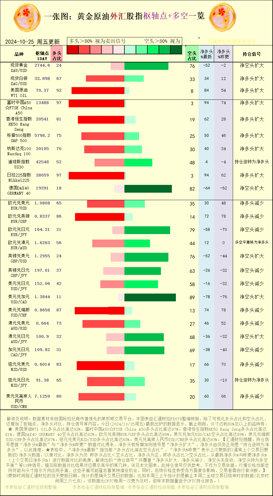 标题:一张图:2024/10/25黄金原油外汇股指“枢纽点+多空持仓信号”一览
