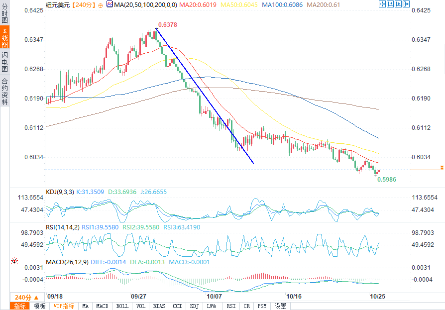 纽元/美元上周五跌至0.5988,可能连续第四周收低。