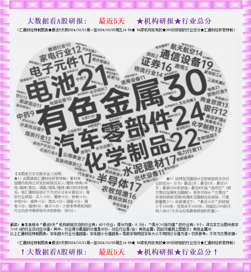 ★本表格中“最近5天”机构研报涉及的行业有:60个行业,得分均值:9.3分,“得分>2倍均值”的行业有:5个,详见本文云图中数字>18.6的行业及对应分值。其中,行业得分最高的分值是30分,对应行业是/含:有色金属,因此可看到下图显示:有色金属30。