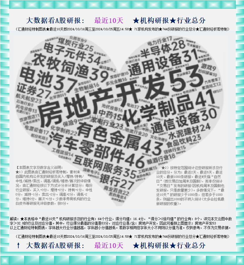 ★本表格中“最近10天”机构研报涉及的行业有:64个行业,得分均值:16.4分,“得分>2倍均值”的行业有:8个,详见本文云图中数字>32.8的行业及对应分值。其中,行业得分最高的分值是53分,对应行业是/含:房地产开发,因此可看到下图显示:房地产开发53。
