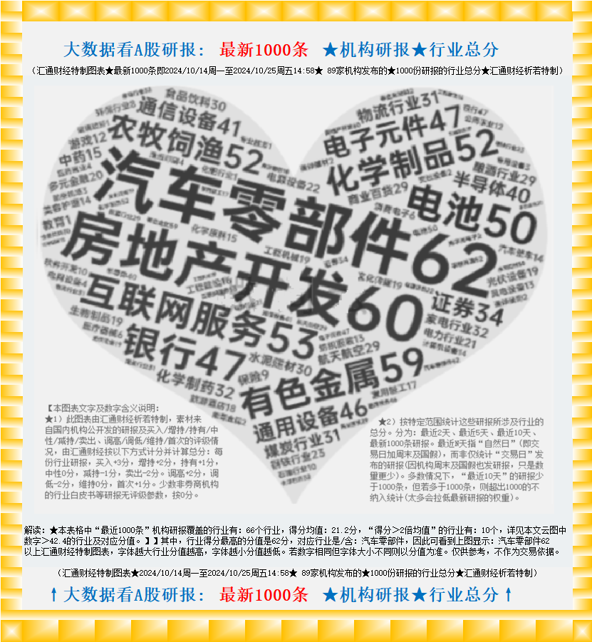 ★本表格中“最近1000条”机构研报覆盖的行业有:66个行业,得分均值:21.2分,“得分>2倍均值”的行业有:10个,详见本文云图中数字>42.4的行业及对应分值。其中,行业得分最高的分值是62分,对应行业是/含:汽车零部件,因此可看到下图显示:汽车零部件62。