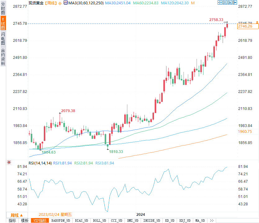 现货黄金呈现震荡上行的趋势,截止10月25日,黄金价格报每盎司2,747.38美元,本周累计上涨0.42%。周三,黄金价格更是触及历史高位2,758.37美元,连续第三周上涨。尽管金价本周中一度出现获利回吐的压力,但在避险情绪的支撑下价格迅速回升,并录得小幅涨幅。