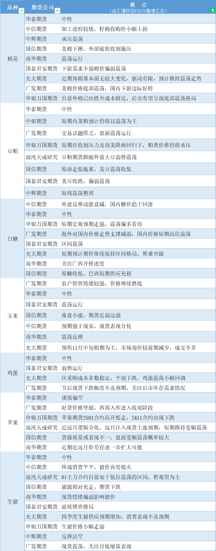 期货公司观点汇总一张图:10月29日农产品(棉花、豆粕、白糖、玉米、鸡蛋、生猪等)
