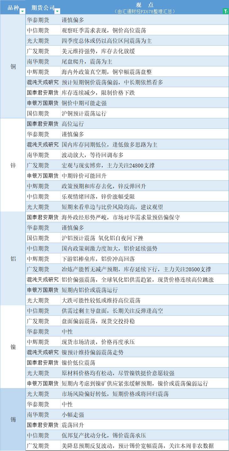 期货公司观点汇总一张图:10月29日有色系(铜、锌、铝、镍、锡等)