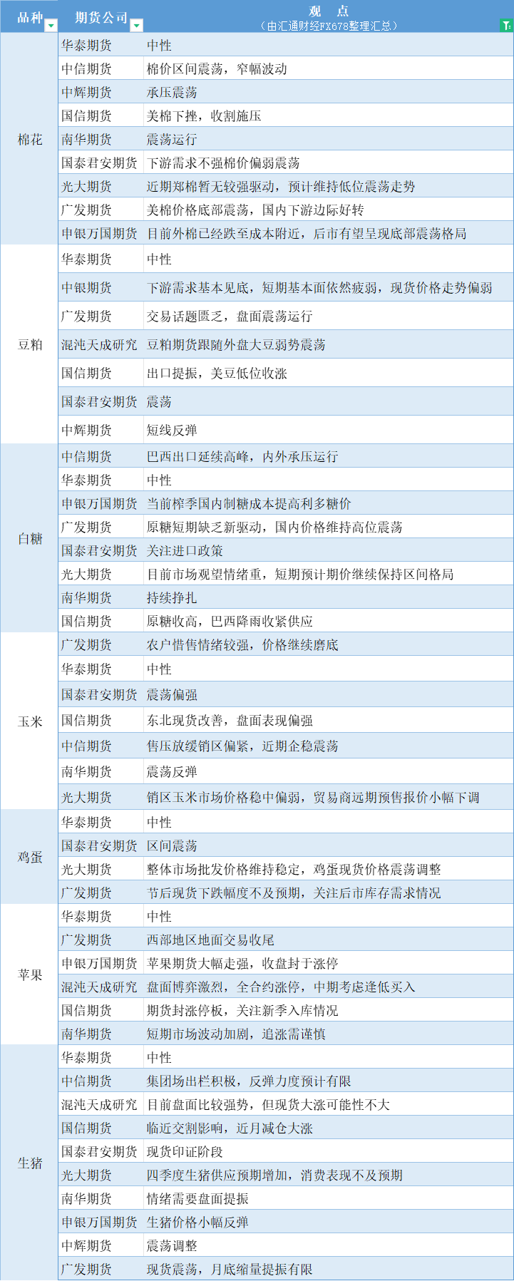 期货公司观点汇总一张图:10月31日农产品(棉花、豆粕、白糖、玉米、鸡蛋、生猪等)