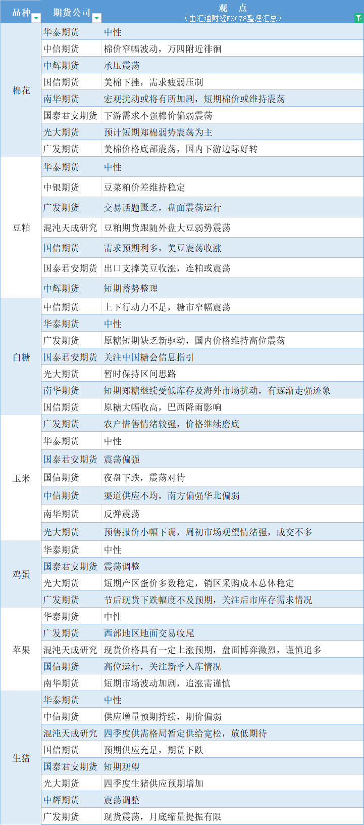 期货公司观点汇总一张图:11月1日农产品(棉花、豆粕、白糖、玉米、鸡蛋、生猪等)