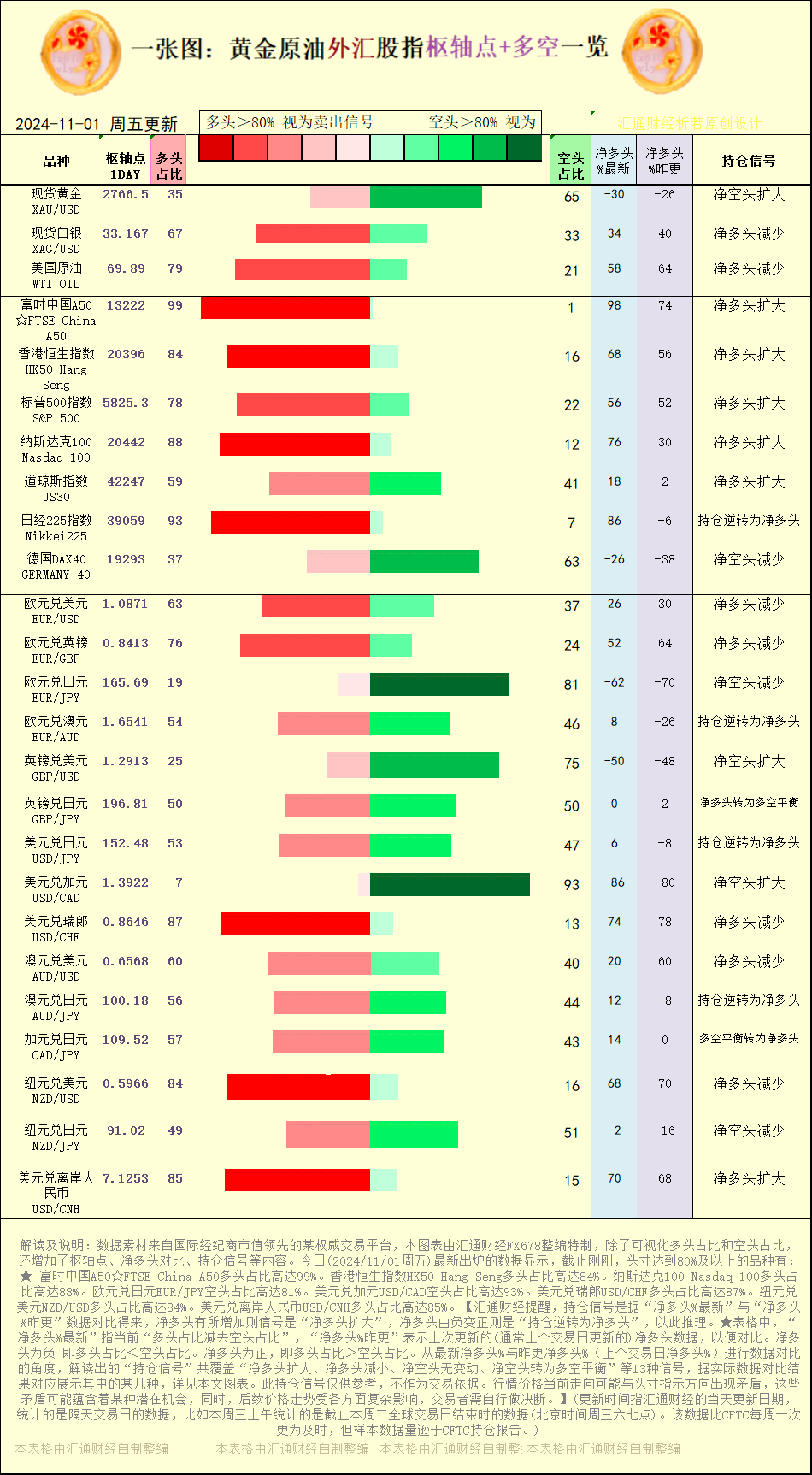 标题:一张图:2024/11/1黄金原油外汇股指“枢纽点+多空持仓信号”一览