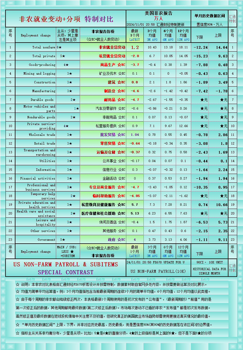 汇通财经APP讯——今晚11月1日美国非农仅增1.2万,研究非农“细分项”的看过来,一张图:美国非农就业+各行业分项就业变动一览,包括最新值、3个月均值、6个月均值、12个月均值、各项就业指标历史数据置信度90%的区间(指月度历史数据有90%的历史数据落在该区间内)。