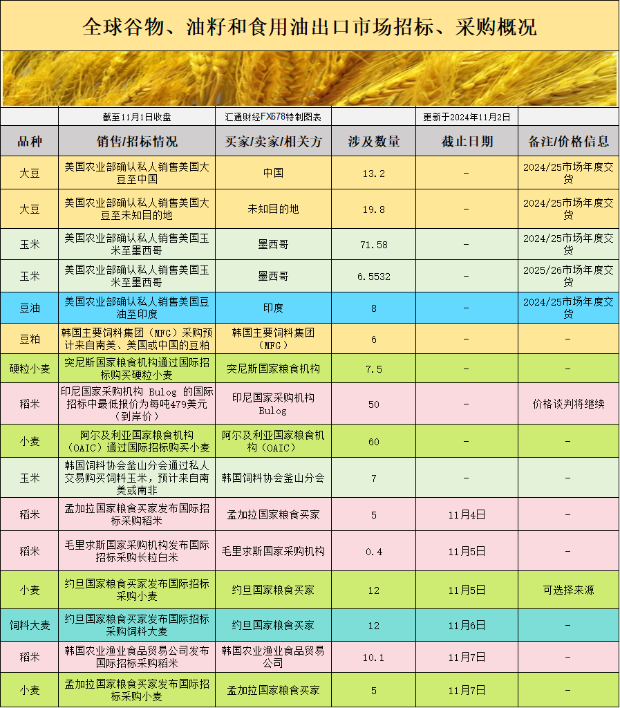 全球谷物、油籽和食用油出口市场招标、采购概况: