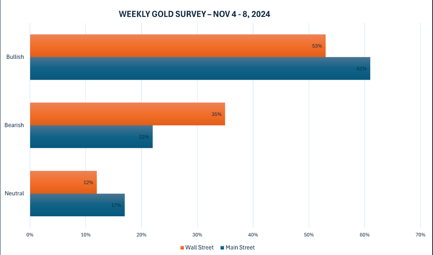 上周,17 名分析师参与了 Kitco News 黄金调查,多少分析师仍看涨后市,但上周的看涨多数比例进一步收窄。九名专家(即 53%)预计 金价将在未来一周上涨,而六名分析师(即 35%)预计贵金属价格将下跌。剩下的两位分析师(占总数的 12%)正在观望选举和美联储会带来什么。